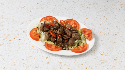 A Vietnamese classic dish of tender beef cubes on a bed of salad & dressing.