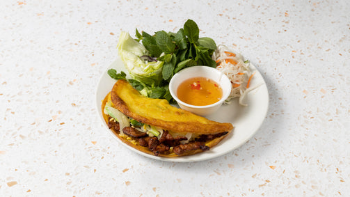 With grilled pork, prawn, onion, mushroom, mung bean and beansprout filling. Served with fresh herbs, salads & ‘Nước Chấm’ dipping sauce