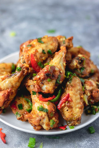 Lightly dusted in potato flour with peppercorn salt, chilli and garlic dressing